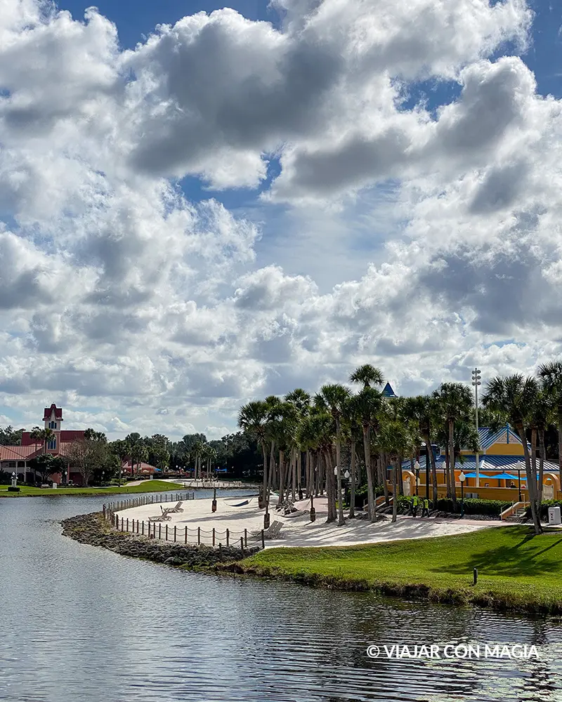 Tres cosas se destacan de inmediato en el Disney’s Caribbean Beach Resort: playas blancas, Disney Skyliner y ambientación tropical.