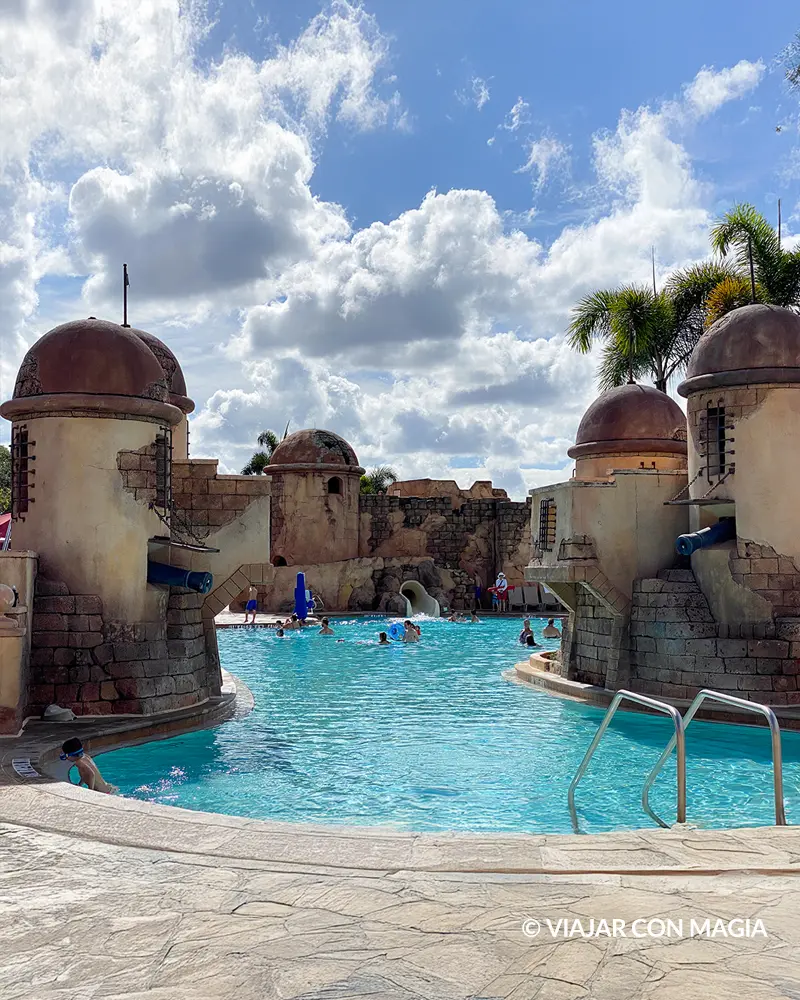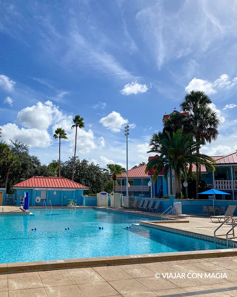 El Disney's Caribbean Beach Resort es el punto justo entre precio, accesibilidad y diversión y cuenta con 6 piscinas distribuidas por todo el resort.