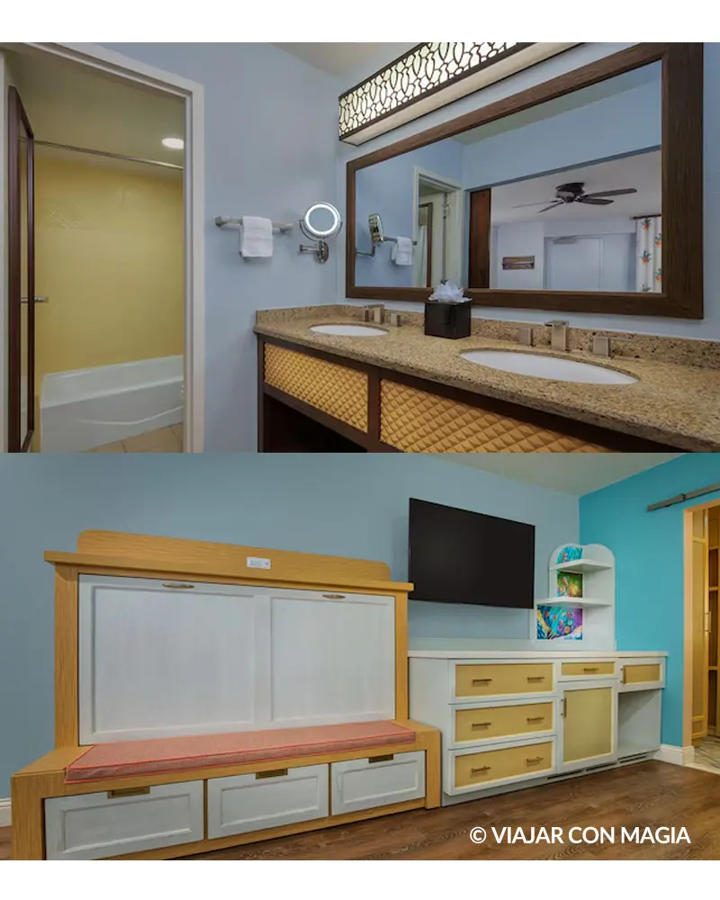 Las habitaciones de Disney’s Caribbean Beach Resort están inmersas en un ambiente tropical, con colores vibrantes y detalles de madera oscura que te harán sentir en una isla paradisíaca.