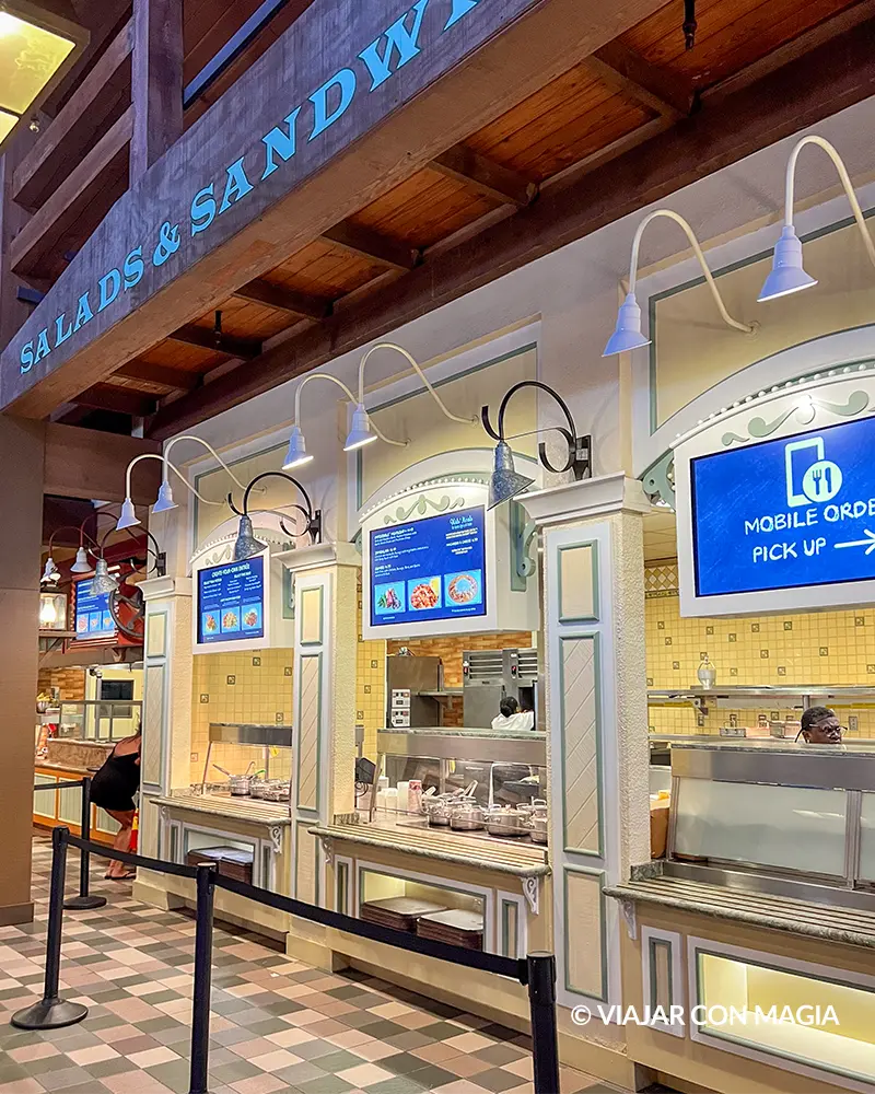 Ubicado en el edificio principal del resort, este patio de comidas funciona todo el día con una variedad de opciones rápidas: desayunos clásicos (waffles de Mickey, pancakes, huevos), almuerzos y cenas con hamburguesas, pastas, pizzas, sándwiches y platos inspirados en el sur. Rápido, cómodo y práctico para cualquier momento del día.